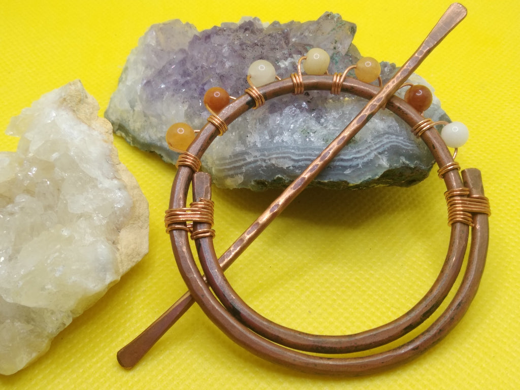 Honey Jade--ranging from pale yellow to brown--adorn this concentric circle hammered copper hair or scarf pin. 2.25" dia.; 4" stick.